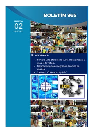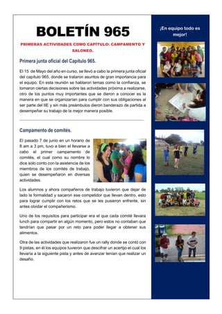 El documento resume las primeras actividades del Capítulo 965 del Instituto de Ingenieros Industriales, incluyendo su primera junta oficial, un campamento para integrar a los comités de trabajo, y un saloneo para dar a conocer el capítulo a los nuevos estudiantes.