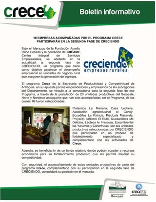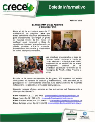 El programa CRECE abrió su 5ª convocatoria hasta el 30 de abril de 2011, seleccionando iniciativas empresariales en diversas etapas de madurez para recibir apoyo en diseño, fortalecimiento y creación de planes de negocio. En más de 24 meses, el programa ha beneficiado a 157 empresas, mejorando su competitividad en el mercado local y regional, y ahora 10 de ellas participarán en la segunda fase del programa 'Creciendo' para potenciar su desempeño en unidades de negocio rural. Adicionalmente, se llevarán a cabo capacitaciones en buenas prácticas de manufactura para empresas del sector alimentos y se han organizado eventos para promover el emprendimiento y facilitar el contacto con potenciales clientes.