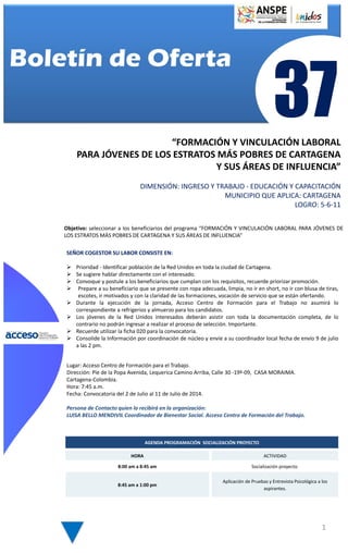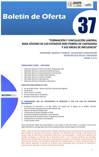 El documento describe un programa de formación y vinculación laboral para jóvenes pobres en Cartagena y sus alrededores. El programa ofrece 700 cupos para diferentes formaciones técnicas y capacitaciones. Los requisitos para aspirar incluyen ser bachiller, tener entre 18 y 30 años, no estar estudiando ni trabajando, y aprobar el proceso de selección que incluye pruebas psicológicas y entrevista.