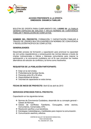 Este documento describe un proyecto de capacitación para líderes comunitarios sobre normas de convivencia familiar y resolución pacífica de conflictos. El proyecto consiste en charlas semanales durante dos meses para enseñar estas habilidades a 50 líderes. Los temas incluyen normas de convivencia, tipos de conflictos, comunicación efectiva y resolución pacífica. El proyecto comenzará el 10 de abril en el Centro Comercial Ronda Real con el objetivo de mejorar la participación y convivencia ciudadana.