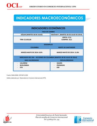 El documento presenta información sobre diferentes indicadores económicos como tasas de cambio, desempleo y mercados de acciones en Colombia. Luego, analiza oportunidades de negocio para productos colombianos en países como Brasil, Unión Europea, Canadá, Chile, el Caribe y el Triángulo Norte de Centroamérica. Algunos de los productos con potencial identificados son atún enlatado, snacks salados y dulces, frutas frescas, preparaciones alimenticias, legumbres y hortalizas para Canadá, así como