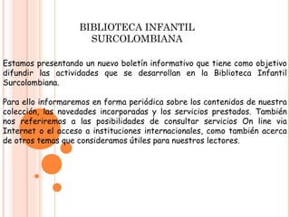 Este boletín presenta las actividades y servicios de la Biblioteca Infantil Surcolombiana. Informa sobre la colección y nuevos materiales. Los servicios incluyen consulta en línea, referencia, consulta en la biblioteca y a distancia. También presenta resúmenes de libros infantiles y la lectura de la semana sobre un ángel que cuida a los niños.