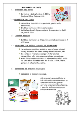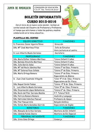 Este boletín informativo presenta la plantilla del centro educativo para el curso 2015-2016, incluyendo el equipo directivo, profesorado y personal no docente. También resume el calendario escolar con fechas importantes como vacaciones, festividades y horarios de visitas. Finalmente, incluye algunas consideraciones finales sobre normas de funcionamiento del centro.