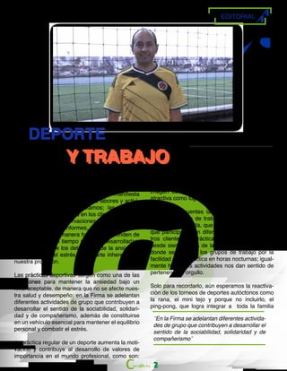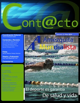 Este documento contiene información sobre las siguientes secciones: 1) Contenido y Revisión, que lista los nombres de las personas que coordinaron la edición y revisaron el contenido. 2) Fotos, que nombra a la persona responsable de las fotos. 3) Diseño y Publicación, que menciona al diseñador. 4) Comentarios, que anuncia los temas que serán cubiertos.