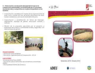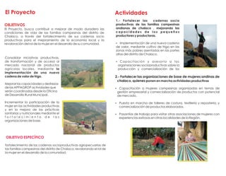 El documento describe un proyecto para fortalecer las cadenas socioproductivas de las familias campesinas en Chalaco, Perú mediante el empoderamiento de las mujeres. El proyecto capacitará a las mujeres en liderazgo, organización, equidad de género, educación sanitaria y nutrición para asumir roles iguales a los hombres. También implementará una nueva cadena de valor de trigo y fortalecerá organizaciones de base de mujeres para actividades productivas como costura y repostería para mejorar sus condiciones de vida.