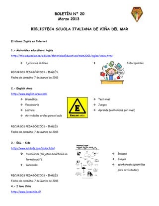 El boletín presenta varios recursos en línea para aprender inglés, incluyendo sitios web con materiales educativos, ejercicios de gramática, vocabulario, lectura y actividades orales. También presenta un diario chileno en inglés y sitios con recursos de vocabulario, lectura, gramática y habilidades de escucha y habla. Finalmente, incluye citas sobre el poder del lenguaje y la comunicación a través de Internet.