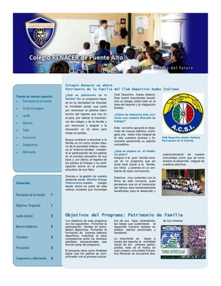 El documento resume las actividades recientes del Jardín Peques Renacer, incluyendo una muestra de material didáctico que reunió contribuciones de padres, educadores y asistentes. El jardín ahora es parte de un programa llamado Patrimonio de la Familia que busca promover la participación familiar y el desarrollo integral de los niños. El jardín ofrece un espacio de alta calidad para fomentar el aprendizaje y los buenos valores en la etapa preescolar.