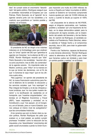 El documento resume las declaraciones del presidente de Nueva Canarias, Román Rodríguez, quien afirma que la alianza NC-PSOE es la única opción que garantiza la agenda canaria en las próximas elecciones generales del 26 de junio. Rodríguez advierte sobre las "mentiras" de las promesas de bajar impuestos y aumentar el gasto social de forma "desorbitada" que hacen otros partidos. Defiende que el candidato de NC, Pedro Quevedo, junto con los socialistas, son los garantías de conseguir los objet