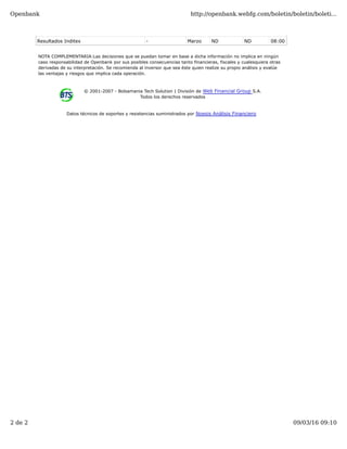 El documento resume las claves bursátiles del día, señalando que los mercados europeos y estadounidenses cerraron con pérdidas moderadas tras los comentarios de Draghi sobre la economía global. También analiza los resultados que presentará Inditex y los datos económicos que se publicarán, como los inventarios de crudo en EEUU e índice de precios de vivienda en España. Por último, detalla los soportes y resistencias de varias empresas del Ibex 35.