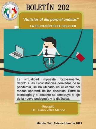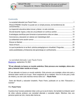 El documento trata sobre la educación en el siglo XXI. Debido a la pandemia, la educación se ha visto forzada a adoptar la virtualidad, colocando la tecnología y al docente en el centro del nuevo modelo educativo y didáctico. Se analizan varios artículos sobre temas educativos como la enseñanza, la inspección educativa, el pensamiento crítico, la convivencia, la solidaridad y la educación en libertad.