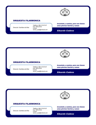 El documento proporciona la información de contacto de la Orquesta Filarmónica con sede en Santillana del Mar, incluyendo su dirección, teléfono, fax y correo electrónico de contacto. Además, incluye los nombres de varios miembros de la orquesta.