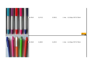 El documento lista los precios y detalles de varios artículos de referencia (Ref.) incluyendo el precio por unidades de 25,000 y 50,000, el peso y medidas de la caja, y la duración de las ofertas de grabación de un color. Los precios y especificaciones se proporcionan para 16 artículos.