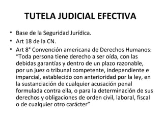 El documento trata sobre la tutela judicial efectiva como base de la seguridad jurídica. Explica que la tutela judicial efectiva garantiza el acceso a la jurisdicción, el respeto al debido proceso y el acceso al cumplimiento de sentencias. También establece límites como la ley previa, la irretroactividad de la ley penal, los jueces naturales y la prohibición de ser obligado a declarar contra sí mismo.