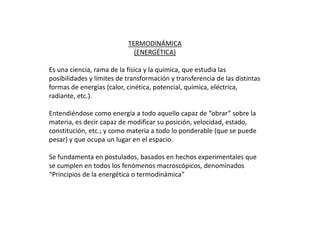 Este documento presenta una introducción a los conceptos básicos de termodinámica. Explica que la termodinámica estudia la transformación y transferencia de energía en sistemas. Luego describe los tres principios de la termodinámica, incluyendo el principio de conservación de energía, el principio de irreversibilidad y el principio de equilibrio. Finalmente, define conceptos clave como sistema termodinámico, propiedades de los sistemas y estados de la materia.