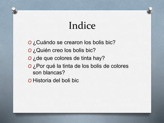 Los bolis Bic fueron creados en 1945 en Argentina por László Bíró después de la Segunda Guerra Mundial y originalmente se llamaban "cristal Bic". Bic ha expandido su línea de productos desde los bolis estándar azul, negro y rojo a una variedad de colores y nuevos diseños a través de los años, mientras que también ha comenzado a producir otros artículos como cuchillas de afeitar y subrayadores.