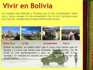 El documento presenta información sobre varias actividades turísticas populares en Bolivia como rafting, bungee jumping, visitas a parques acuáticos, andinismo en montañas como Huayna Potosí e Illimani, y navegar en balsas de totora en el lago Titicaca. También incluye detalles sobre los costos de algunas actividades y las regiones o departamentos donde suelen realizarse.