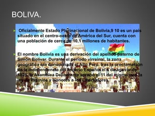 Bolivia es un país situado en el centro-oeste de Sudamérica con una población de aproximadamente 10,1 millones de habitantes. La cultura boliviana proviene de una variedad de orígenes indígenas, españoles y andinos y se caracteriza por estar orientada a la familia y tradiciones como el matrimonio. Bolivia también cuenta con una rica biodiversidad y atractivos turísticos naturales y culturales como el Parque Nacional Sajama y el Monumento a la Virgen del Socavón en Oruro.