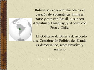 Bolivia se encuentra en el corazón de Sudamérica y limita con Brasil, Argentina, Paraguay, Perú y Chile. El gobierno de Bolivia es democrático, representativo y unitario según su constitución. Algunos de los principales lugares turísticos de Bolivia incluyen el Palacio de Gobierno y el Illimani en La Paz, el lago Titikaka, el Salar de Uyuni, el Cerro Rico y la Casa de la Moneda en Potosí, y los viñedos de Concepción en Tarija. El c