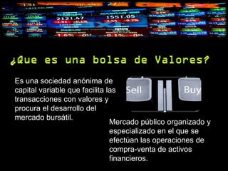 Este documento describe el funcionamiento de las bolsas de valores y los mercados financieros. Explica que las bolsas de valores facilitan las transacciones entre compradores y vendedores de activos financieros como acciones y bonos. También describe los diferentes tipos de inversionistas, emisores, corredores e instrumentos financieros que participan en el mercado bursátil.