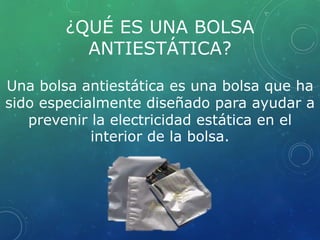 Este documento explica qué son las bolsas antiestáticas, para qué se usan y cómo funcionan. Las bolsas antiestáticas están diseñadas para prevenir la electricidad estática y se usan comúnmente para almacenar equipos electrónicos sensibles. Existen dos tipos principales: bolsas con película metalizada que actúan como una jaula de Faraday desviando descargas eléctricas, y bolsas de polietileno que minimizan la generación de estática.