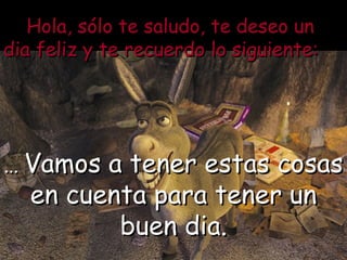 El documento ofrece consejos para tener un buen día, incluyendo mirarse al espejo y verse guapa, tomar un baño relajante, y saber a lo que uno se enfrentará. Aconseja sonreír, apreciar el cariño del hogar, despedirse con un beso antes de ir a trabajar, abrazar a los amigos en el trabajo, y pensar en la ayuda de los amigos en lugar de la cara de los jefes. Finalmente, desea al lector un buen día y semana, y le anima a desear lo mismo a sus amigos.