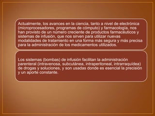 Los avances en electrónica y farmacología han provisto sistemas de infusión más seguros y precisos para administrar medicamentos. Las bombas de infusión facilitan la administración parenteral de drogas y soluciones donde se requiere precisión y un aporte constante. La mayoría de pacientes hospitalizados requieren por lo menos una vía intravenosa, ya sea para administrar líquidos, realizar procedimientos diagnósticos o terapéuticos, o administrar fármacos cuando no es posible usar la vía oral.
