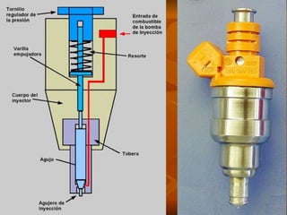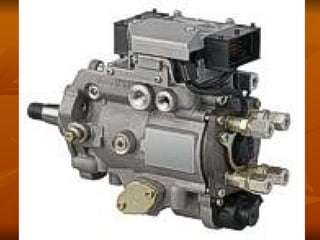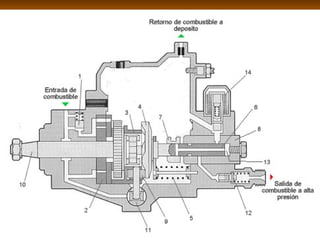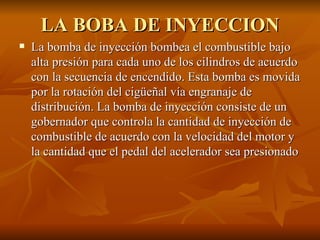 El documento describe los componentes y funcionamiento de los sistemas de inyección de combustible en motores de automóviles, incluyendo bombas de inyección, inyectores y el sistema common rail. Explica que la bomba de inyección bombea combustible a alta presión a los cilindros según la secuencia de encendido y que existen bombas lineales y rotativas. También describe los componentes clave de un inyector y cómo el sistema common rail mantiene presión constante en una tubería común para todos los inyectores.