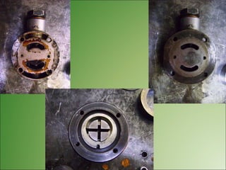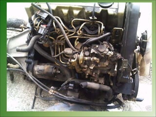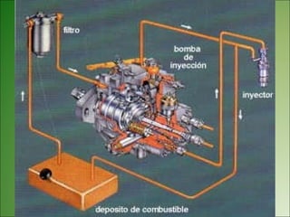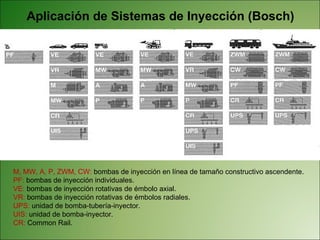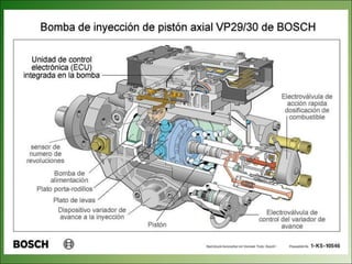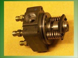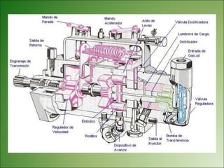 El documento describe los diferentes tipos de bombas de inyección rotativas utilizadas en motores diésel, incluyendo sus características y componentes. Presenta información sobre bombas Bosch VE, Lucas CAV y Rosamaster, detallando partes como el cabezal, válvula de control de presión de transferencia y vareador de avance de inyección. También explica brevemente el funcionamiento de las bombas rotativas y sus aplicaciones en vehículos y maquinaria agrícola.