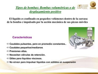 El documento describe diferentes tipos de bombas, incluyendo bombas volumétricas y centrífugas. Las bombas volumétricas impulsan el líquido mediante la acción mecánica de sus piezas móviles, mientras que las bombas centrífugas comunican energía cinética al fluido. También se discuten conceptos como cavitación, accesorios para el transporte de fluidos, y partes clave de las bombas como la carcasa, el rodete y el sello mecánico.