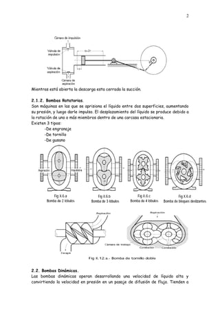 El documento describe los diferentes tipos de bombas, incluyendo bombas de desplazamiento positivo como bombas reciprocantes y rotatorias, y bombas dinámicas como bombas centrífugas. Explica cómo las bombas centrífugas funcionan mediante la conversión de la velocidad de un impulsor giratorio en presión del fluido. También proporciona detalles sobre la clasificación, componentes y selección de bombas centrífugas según el caudal, carga, tipo de fluido y otros factores. Finalmente, presenta un ejemplo num