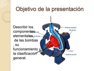 Este documento describe los componentes básicos de las bombas, su clasificación y funcionamiento. Explica que una bomba convierte energía mecánica en energía que adquiere un fluido en forma de presión o velocidad. Se clasifican las bombas en positivas de desplazamiento y dinámicas. Describe los principales componentes como la carcasa, impulsores y su clasificación. Explica el funcionamiento de diferentes tipos de impulsores como de flujo radial, mixto y axial.