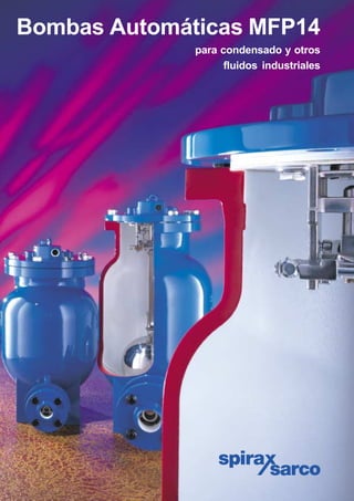 Este documento describe la bomba automática MFP14 de Spirax Sarco diseñada para eliminar y recuperar condensado de manera eficiente. La bomba usa vapor u otro gas como fuente de energía para bombear líquidos sin necesidad de motores eléctricos. Viene en varios tamaños, materiales y conexiones para adaptarse a diferentes aplicaciones industriales como la eliminación de condensado de intercambiadores de calor o equipos de vacío. El documento también incluye gráficos para seleccionar el tamaño adecu