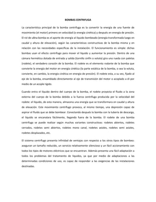 Este documento describe las bombas centrífugas. Explica que estas bombas usan la fuerza centrífuga producida por el rotor giratorio para impulsar el líquido y aumentar su presión. También clasifica las bombas centrífugas según la orientación del rotor (horizontal o vertical) y la configuración de los soportes (cantiléver, entre cojinetes o verticalmente suspendidas). Finalmente, señala que pueden ser de una o varias etapas, y que el diseño de la carcasa depende de la aplicación, aunque exist