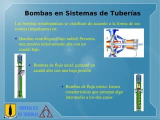El documento describe diferentes tipos de bombas utilizadas en sistemas de tuberías, incluyendo bombas de flujo axial, de flujo mixto y centrífugas. Explica conceptos como la velocidad específica, curvas de bombas, y cómo seleccionar la combinación óptima de bomba y tubería para minimizar costos considerando factores como diámetro, pérdidas de carga y eficiencia.