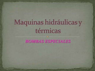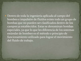 Este documento describe diferentes tipos de bombas especiales, que son aquellas cuyo método de funcionamiento difiere de los sistemas de bombeo estándar. Menciona que las bombas especiales suelen manejar líquidos agresivos y que las más comunes son las bombas de diafragma o membrana. También describe bombas peristálticas, que bombean fluidos sin contacto directo, y bombas de pistón electromagnético. Finalmente, indica que las bombas multietapa están diseñadas para altas presiones y requieren un diseño separ