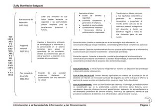 El documento presenta los apartados del Plan Nacional de Desarrollo 2007-2011 de México, que incluyen el estado de derecho y seguridad, economía competitiva y generadora de empleos, igualdad de oportunidades, sustentabilidad ambiental y democracia efectiva. También describe el Programa Sectorial de Educación 2007-2011, cuyo objetivo es impulsar el uso de tecnologías de información en el sistema educativo para apoyar el aprendizaje de los estudiantes y ampliar sus competencias. Finalmente, analiza brevemente los avances