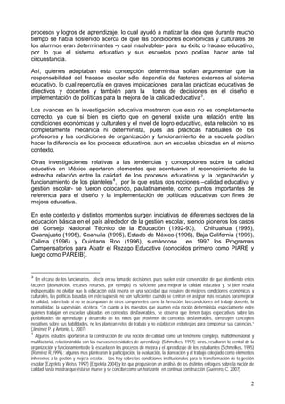 Este documento describe el contexto y desarrollo de la gestión escolar en México. Detalla algunos elementos clave como la reforma educativa de 1993, los esfuerzos para mejorar la calidad educativa, y cómo las investigaciones mostraron la importancia de la organización escolar. También resume varias iniciativas pioneras de gestión escolar en los estados de México en los años 90 y cómo el tema se ha ido posicionando en las políticas educativas federales y estatales desde entonces.