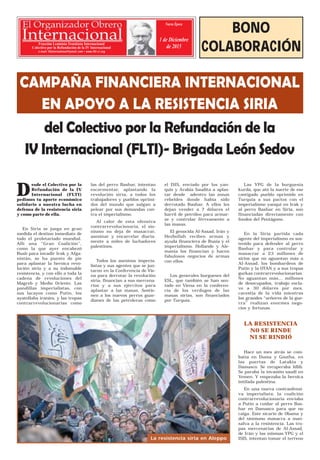 El documento pide apoyo financiero para la resistencia siria contra la "Gran Coalición" imperialista que busca aplastar la revolución siria. Explica que en Siria se juega el destino del proletariado mundial y que múltiples agentes imperialistas financian a fuerzas contrarrevolucionarias para controlar a las masas sirias. A pesar de los bombardeos, la resistencia siria sigue luchando heroicamente contra Al-Assad, Rusia, la OTAN e ISIS. Se pide un aporte para apoyar a la Brig