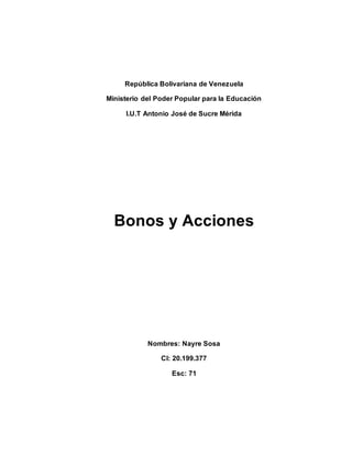 Este documento explica las diferencias entre bonos y acciones como instrumentos de inversión. Un bono es un préstamo a una empresa u organización, mientras que una acción representa parte de la propiedad de una empresa. Los bonos ofrecen pagos de interés garantizados pero no participan en las ganancias de la empresa, mientras que las acciones pueden generar ganancias variables a través de dividendos y apreciación del precio de la acción pero también están sujetas a más riesgo de pérdida de valor. El documento concluye recomendando que, dado