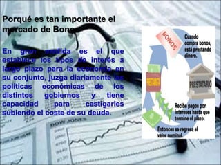 El mercado de bonos es importante porque establece las tasas de interés a largo plazo y juzga las políticas económicas de los gobiernos. Los bonos son instrumentos de deuda utilizados por entidades públicas y privadas para financiarse. Existen diferentes tipos de bonos como bonos convertibles, bonos cupón cero y bonos del estado. Los bonos conllevan riesgos de mercado, crédito e inflación.