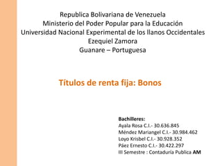 El documento describe diferentes tipos de bonos tramitados en Venezuela, incluyendo letras del tesoro, bonos soberanos, bonos de PDVSA y bonos de deuda agrícola. Explica que los bonos son instrumentos de deuda pública y privada que ofrecen opciones de inversión y financiamiento a largo plazo. También analiza conceptos como la emisión, compra y venta de bonos, y cómo se calcula la rentabilidad de los bonos a través de los intereses, primas o descuentos, y plusvalías obtenidas.