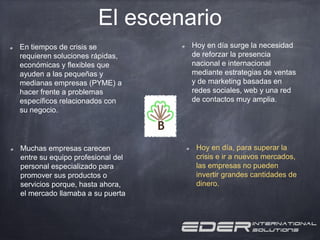 Eder International Solutions presenta su programa "Bonsai Consulting" que ofrece paquetes de servicios de marketing, investigación de mercados y posicionamiento de producto a precios asequibles para ayudar a las pequeñas y medianas empresas a superar la crisis y expandirse a nuevos mercados utilizando nuevas tecnologías y redes sociales. Los paquetes cuestan menos de 400€ al mes y incluyen servicios de marketing, investigación de mercados y posicionamiento de producto para mejorar la imagen de la empresa y su posicionamiento.