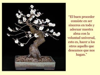 El documento presenta una colección de citas y pensamientos atribuidos al filósofo Confucio sobre temas como la virtud, la sabiduría, la justicia, la belleza y la vida. Las citas enfatizan la importancia de vivir de acuerdo con la armonía universal, ser sinceros y ayudar a los demás, aceptar los errores como oportunidades para mejorar, y encontrar la belleza en todas las cosas aunque no todos puedan verla.
