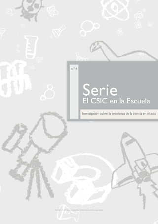 Este documento presenta los números 4, 5 y 6 de la serie "El CSIC en la Escuela", que contienen los resultados de investigaciones realizadas por docentes sobre temas de ciencia en el aula. Se centran en el magnetismo, la óptica y la teoría molecular, y abordan conceptos como los polos magnéticos, los colores y la producción de calor. Más de 50 maestros participaron en las investigaciones con 1136 alumnos de educación infantil y primaria en 7 comunidades autónomas. Los resultados ayudan a identificar preconceptos c