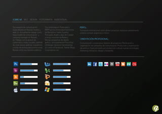 Gabriela Gil presenta su portafolio como publicista apasionada por la comunicación, el diseño, la fotografía y los nuevos medios. Resume su formación universitaria y experiencia laboral en agencias de publicidad. Incluye ejemplos destacados de su trabajo en identidad corporativa, anuncios, revistas, carteles y maquetación realizados durante sus estudios.