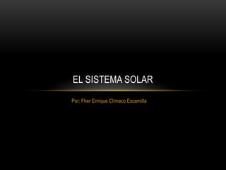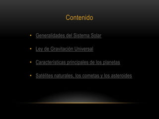 Este documento proporciona información general sobre el Sistema Solar. Explica que contiene 8 planetas que giran alrededor del Sol según la ley de gravitación universal de Isaac Newton. También describe las características principales de los planetas como su forma esférica y sus movimientos de rotación y traslación, así como los satélites naturales, cometas y asteroides que componen el Sistema Solar.