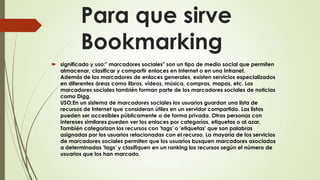 El documento explica qué es el bookmarking social y para qué sirve. El bookmarking social permite a los usuarios almacenar, clasificar y compartir enlaces favoritos de Internet. Los usuarios pueden crear sus propias listas de enlaces y también ver y contribuir a las listas de otros. Esto les permite acceder a sus enlaces favoritos desde cualquier ordenador con conexión a Internet.