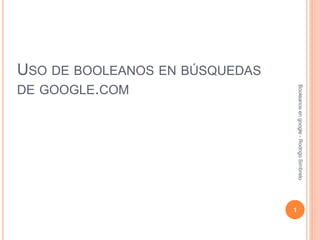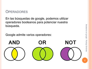 El documento explica cómo usar operadores booleanos como AND, OR y NOT en búsquedas de Google para mejorar los resultados. AND busca términos que aparezcan juntos, OR encuentra cualquiera de los términos, y NOT excluye términos. El uso apropiado de estos operadores permite recopilar información más precisa y específica.