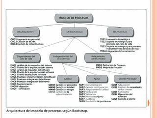 Este documento describe el modelo Bootstrap, un estándar europeo para la evaluación y mejora de procesos de desarrollo de software. Bootstrap surgió en los años 90 como parte de un proyecto europeo para investigar tecnologías de la información, y se basa en los modelos CMM, ISO 9000 y ESA. Su objetivo es acelerar la aplicación de principios e ingeniería de software en la industria europea mediante la evaluación de la madurez de los procesos de una organización y la identificación de áreas de mejora. El modelo de Bootstrap evalúa