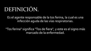 Bordetella pertussis es el agente causante de la tos ferina, una infección aguda de las vías respiratorias superiores. Se propaga de persona a persona a través de partículas aerosolizadas infectadas. Causa tres fases de la enfermedad: catarral, paroxística y de convalecencia. El diagnóstico se realiza mediante pruebas de amplificación de ácidos nucleicos y la confirmación con detección de anticuerpos. El tratamiento es sintomático y la profilaxis se logra mediante la